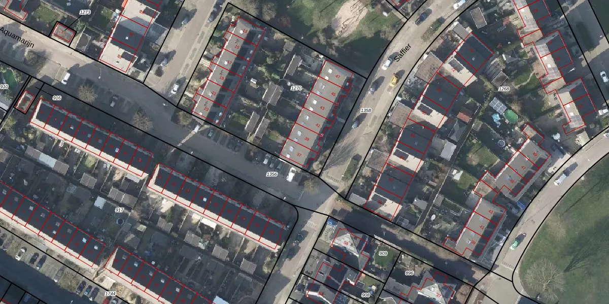 Het perceel waarop Saffier 37 staat heeft een oppervlakte van 1930 m². Dit is een zeer groot perceel. De perceeloppervlakte wordt geregistreerd door het Kadaster. Gedetailleerde informatie over de maten van dit perceel kunt u vinden in het rapport Kadastrale kaart met maatvoering van Saffier 37.