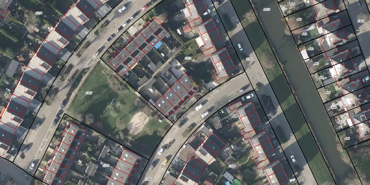 Het perceel waarop Saffier 53 staat heeft een oppervlakte van 3220 m². Dit is een zeer groot perceel. De perceeloppervlakte wordt geregistreerd door het Kadaster. Gedetailleerde informatie over de maten van dit perceel kunt u vinden in het rapport Kadastrale kaart met maatvoering van Saffier 53.