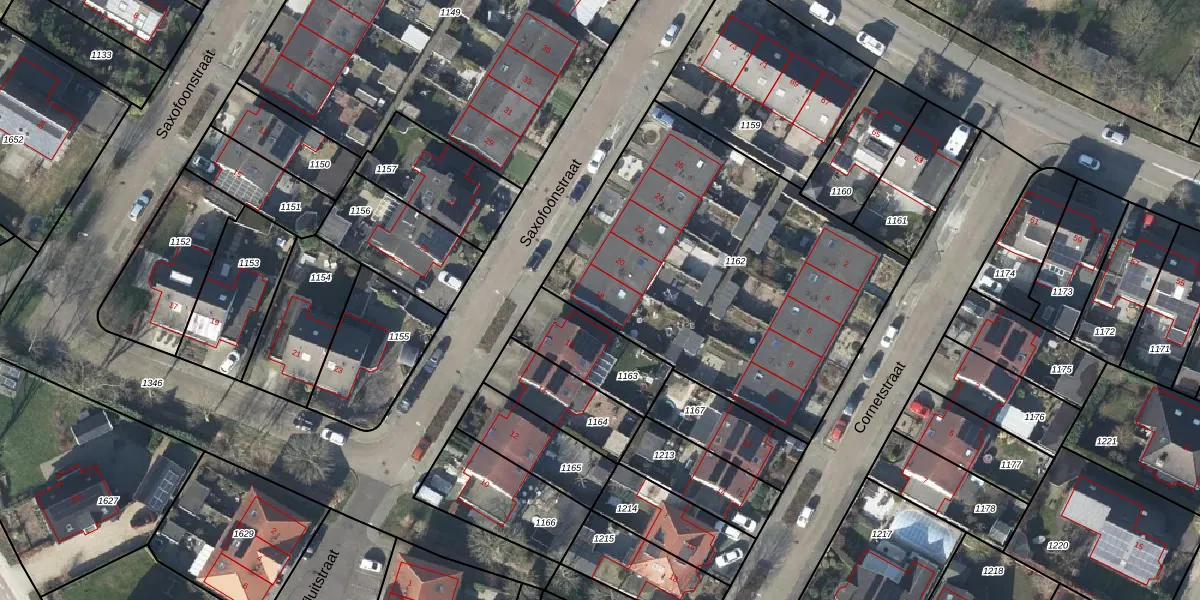Saxofoonstraat 18 is gelegen op kadastraal perceel DVN00D1162. Deze kadastrale aanduiding is uniek en wordt gebruikt door het Kadaster om eigendomsrechten en andere zakelijke rechten vast te leggen. Het perceel maakt onderdeel uit van de kadastrale gemeente Duiven.