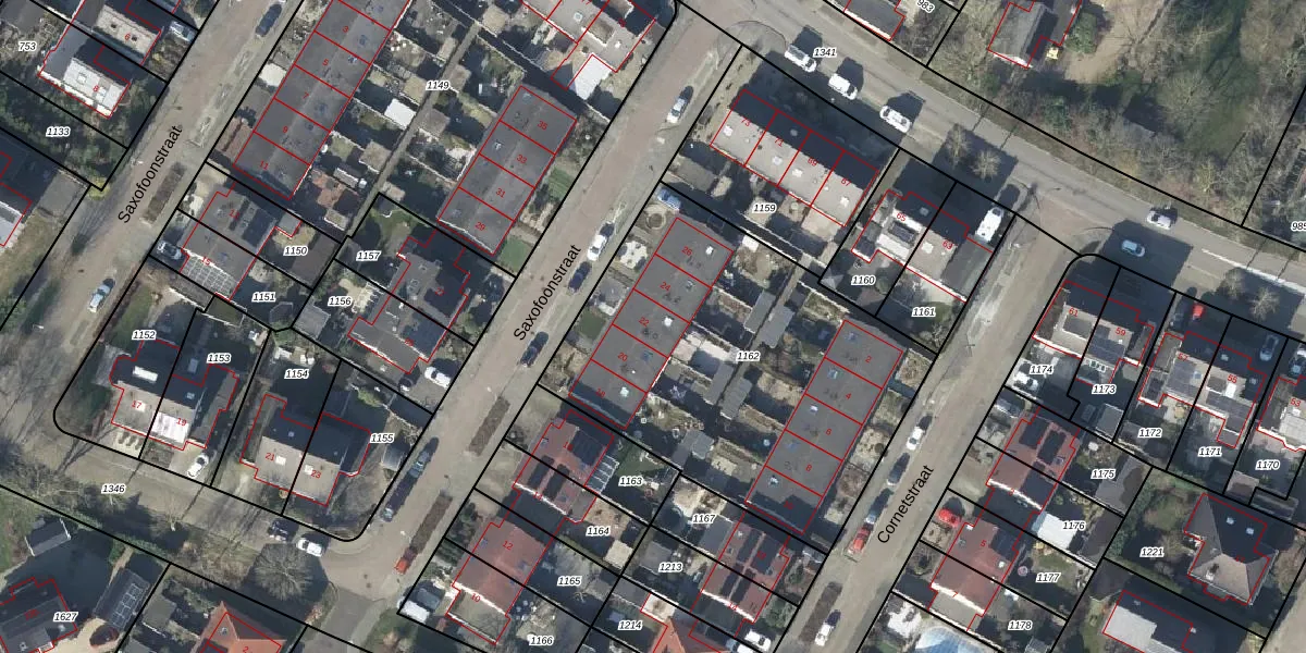 Het perceel waarop Saxofoonstraat 22 staat heeft een oppervlakte van 1835 m². Dit is een zeer groot perceel. De perceeloppervlakte wordt geregistreerd door het Kadaster. Gedetailleerde informatie over de maten van dit perceel kunt u vinden in het rapport Kadastrale kaart met maatvoering van Saxofoonstraat 22.