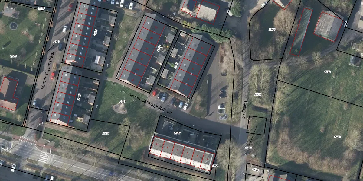 Simon Carmiggeltstraat 2 is gelegen op kadastraal perceel DVN00A2499. Deze kadastrale aanduiding is uniek en wordt gebruikt door het Kadaster om eigendomsrechten en andere zakelijke rechten vast te leggen. Het perceel maakt onderdeel uit van de kadastrale gemeente Duiven.