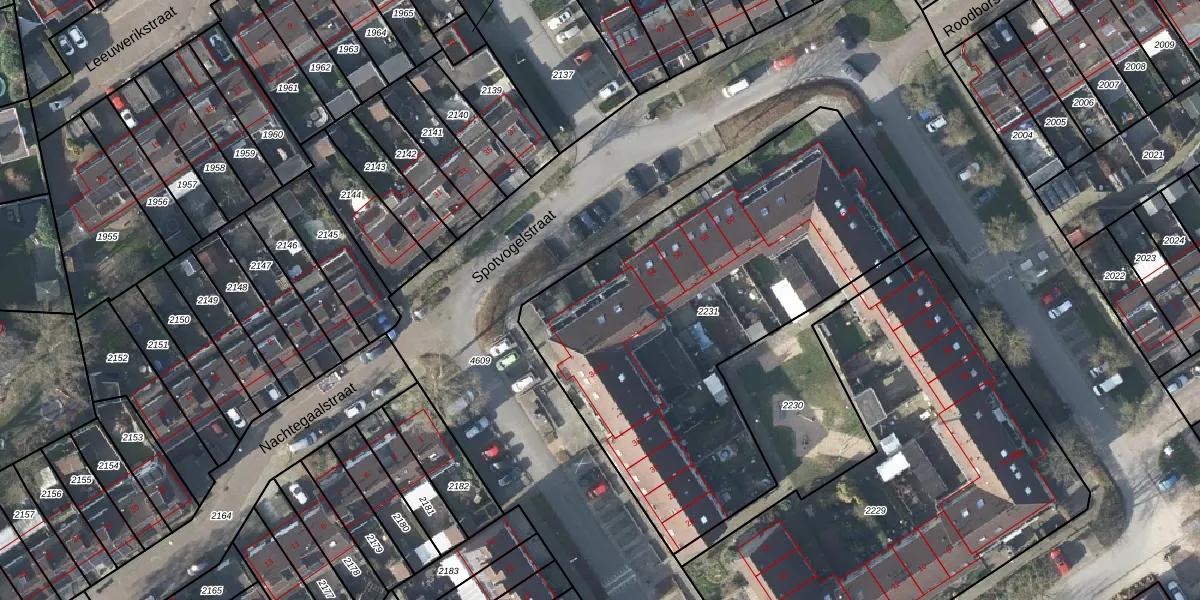 Het perceel waarop Spotvogelstraat 50 staat heeft een oppervlakte van 2200 m². Dit is een zeer groot perceel. De perceeloppervlakte wordt geregistreerd door het Kadaster. Gedetailleerde informatie over de maten van dit perceel kunt u vinden in het rapport Kadastrale kaart met maatvoering van Spotvogelstraat 50.