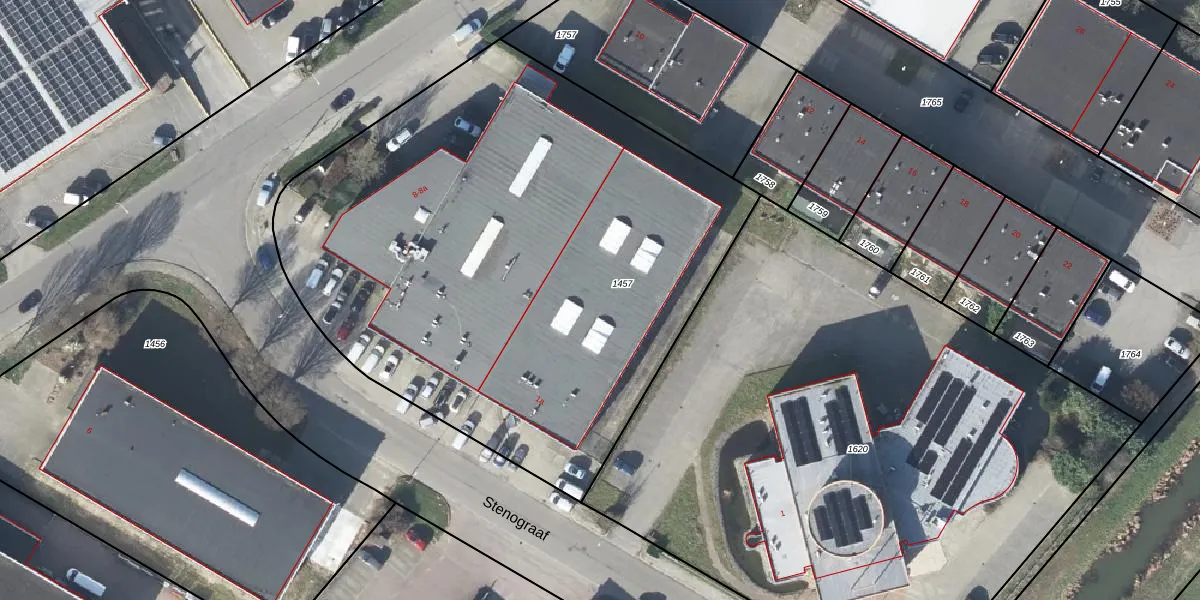 Het perceel waarop Stenograaf 1-a staat heeft een oppervlakte van 3630 m². Dit is een zeer groot perceel. De perceeloppervlakte wordt geregistreerd door het Kadaster. Gedetailleerde informatie over de maten van dit perceel kunt u vinden in het rapport Kadastrale kaart met maatvoering van Stenograaf 1-a.