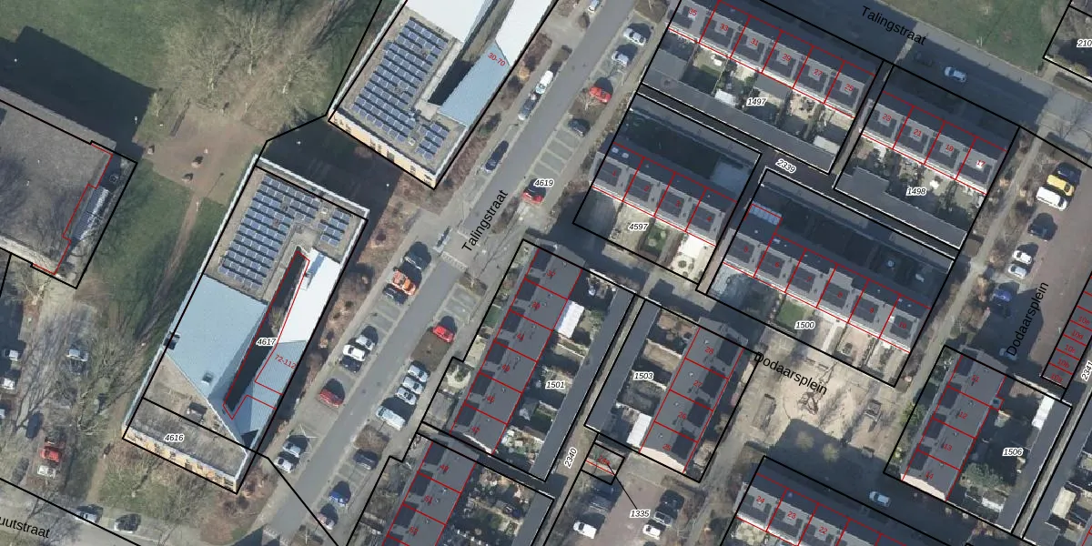 Talingstraat 37 is gelegen op kadastraal perceel DVN00E1501. Deze kadastrale aanduiding is uniek en wordt gebruikt door het Kadaster om eigendomsrechten en andere zakelijke rechten vast te leggen. Het perceel maakt onderdeel uit van de kadastrale gemeente Duiven.