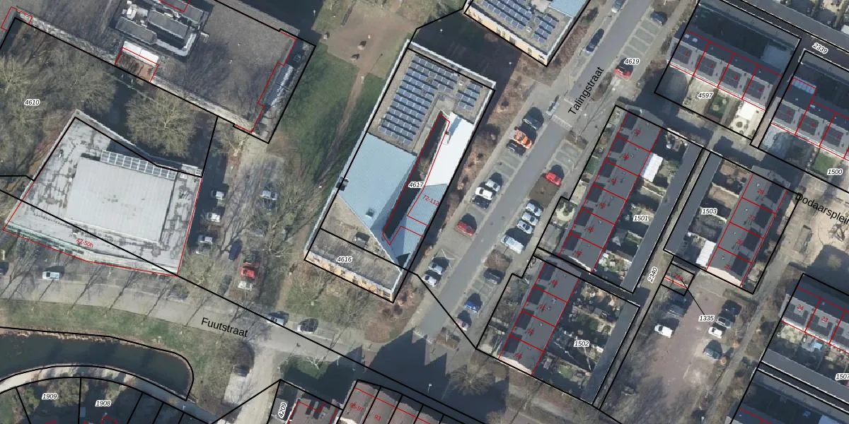 Het perceel waarop Talingstraat 96 staat heeft een oppervlakte van 1089 m². Dit is een zeer groot perceel. De perceeloppervlakte wordt geregistreerd door het Kadaster. Gedetailleerde informatie over de maten van dit perceel kunt u vinden in het rapport Kadastrale kaart met maatvoering van Talingstraat 96.