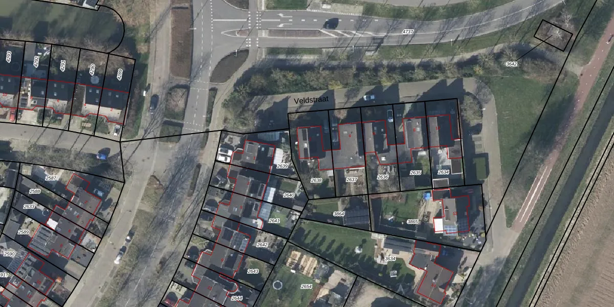 Veldstraat 2 is gelegen op kadastraal perceel DVN00E2638. Deze kadastrale aanduiding is uniek en wordt gebruikt door het Kadaster om eigendomsrechten en andere zakelijke rechten vast te leggen. Het perceel maakt onderdeel uit van de kadastrale gemeente Duiven.