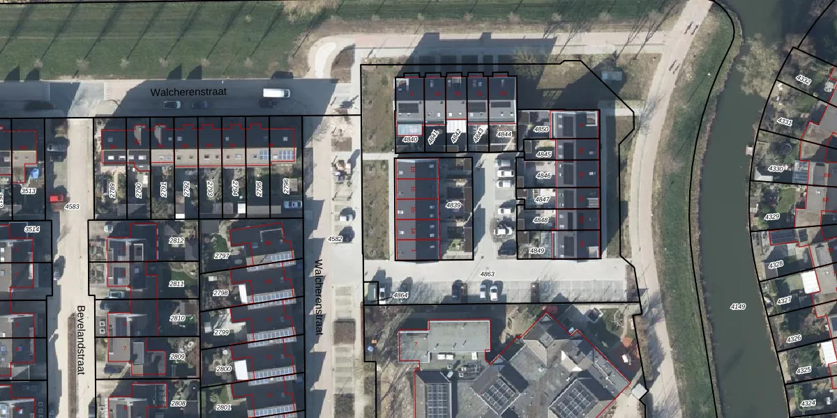 Walcherenstraat 1-b is gelegen op kadastraal perceel DVN00E4839. Deze kadastrale aanduiding is uniek en wordt gebruikt door het Kadaster om eigendomsrechten en andere zakelijke rechten vast te leggen. Het perceel maakt onderdeel uit van de kadastrale gemeente Duiven.