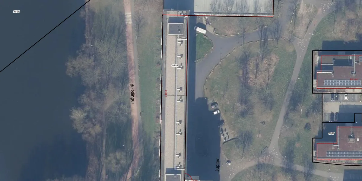 Het perceel waarop Jupiter 105 staat heeft een oppervlakte van 4247 m². Dit is een zeer groot perceel. De perceeloppervlakte wordt geregistreerd door het Kadaster. Gedetailleerde informatie over de maten van dit perceel kunt u vinden in het rapport Kadastrale kaart met maatvoering van Jupiter 105.