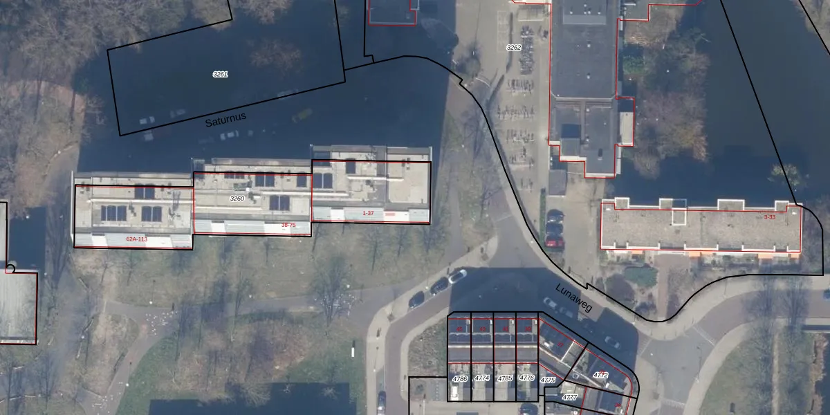 Het perceel waarop Saturnus 25 staat heeft een oppervlakte van 1288 m². Dit is een zeer groot perceel. De perceeloppervlakte wordt geregistreerd door het Kadaster. Gedetailleerde informatie over de maten van dit perceel kunt u vinden in het rapport Kadastrale kaart met maatvoering van Saturnus 25.