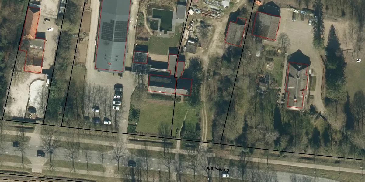 Het perceel waarop Hapertseweg 11 staat heeft een oppervlakte van 8,9 ha. Dit is een zeer groot perceel. De perceeloppervlakte wordt geregistreerd door het Kadaster. Gedetailleerde informatie over de maten van dit perceel kunt u vinden in het rapport Kadastrale kaart met maatvoering van Hapertseweg 11.