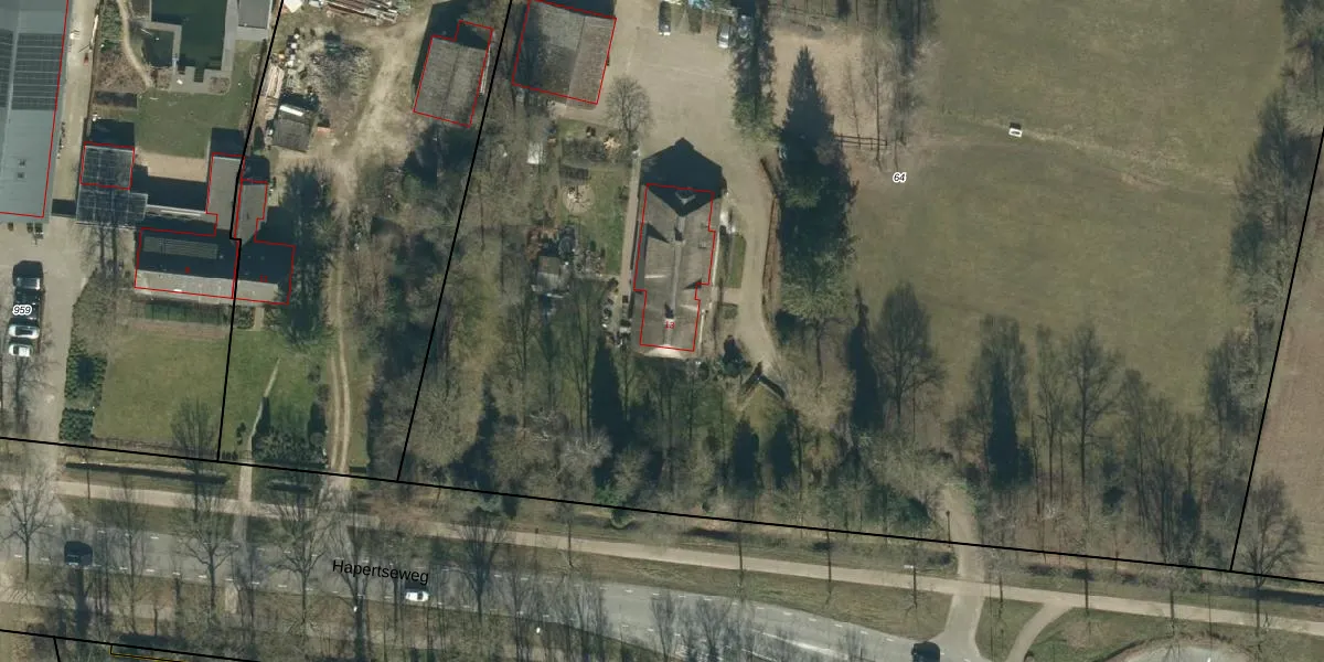 Het perceel waarop Hapertseweg 13 staat heeft een oppervlakte van 1,6 ha. Dit is een zeer groot perceel. De perceeloppervlakte wordt geregistreerd door het Kadaster. Gedetailleerde informatie over de maten van dit perceel kunt u vinden in het rapport Kadastrale kaart met maatvoering van Hapertseweg 13.