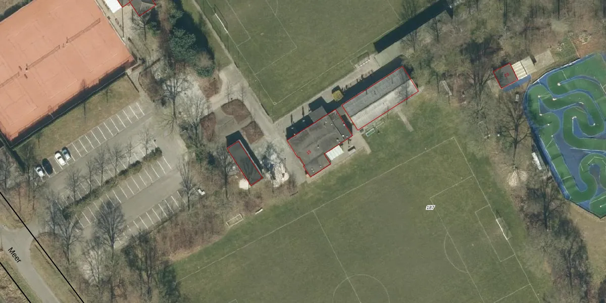 Het perceel waarop Meer 15 staat heeft een oppervlakte van 4,4 ha. Dit is een zeer groot perceel. De perceeloppervlakte wordt geregistreerd door het Kadaster. Gedetailleerde informatie over de maten van dit perceel kunt u vinden in het rapport Kadastrale kaart met maatvoering van Meer 15.