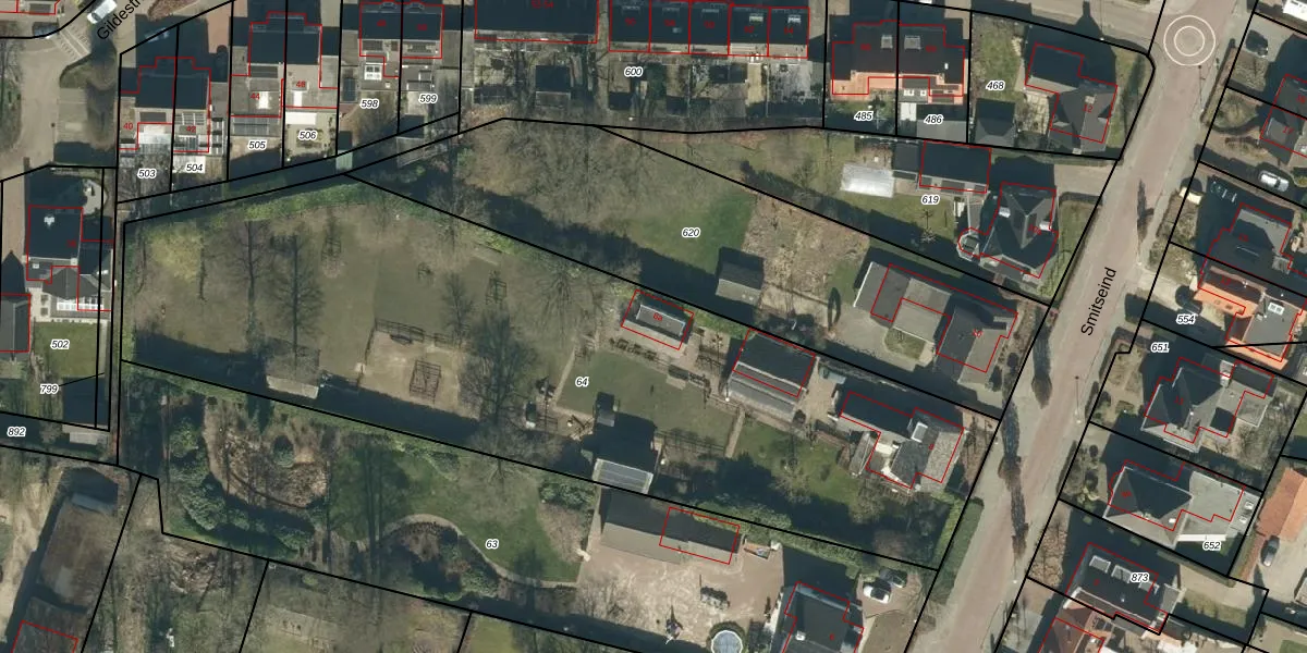Het perceel waarop Smitseind 8-a staat heeft een oppervlakte van 3990 m². Dit is een zeer groot perceel. De perceeloppervlakte wordt geregistreerd door het Kadaster. Gedetailleerde informatie over de maten van dit perceel kunt u vinden in het rapport Kadastrale kaart met maatvoering van Smitseind 8-a.
