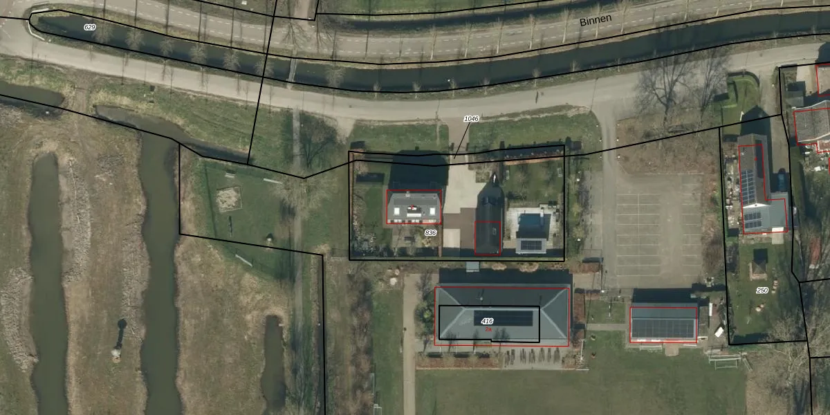 Het perceel waarop Binnen 2 staat heeft een oppervlakte van 1215 m². Dit is een zeer groot perceel. De perceeloppervlakte wordt geregistreerd door het Kadaster. Gedetailleerde informatie over de maten van dit perceel kunt u vinden in het rapport Kadastrale kaart met maatvoering van Binnen 2.