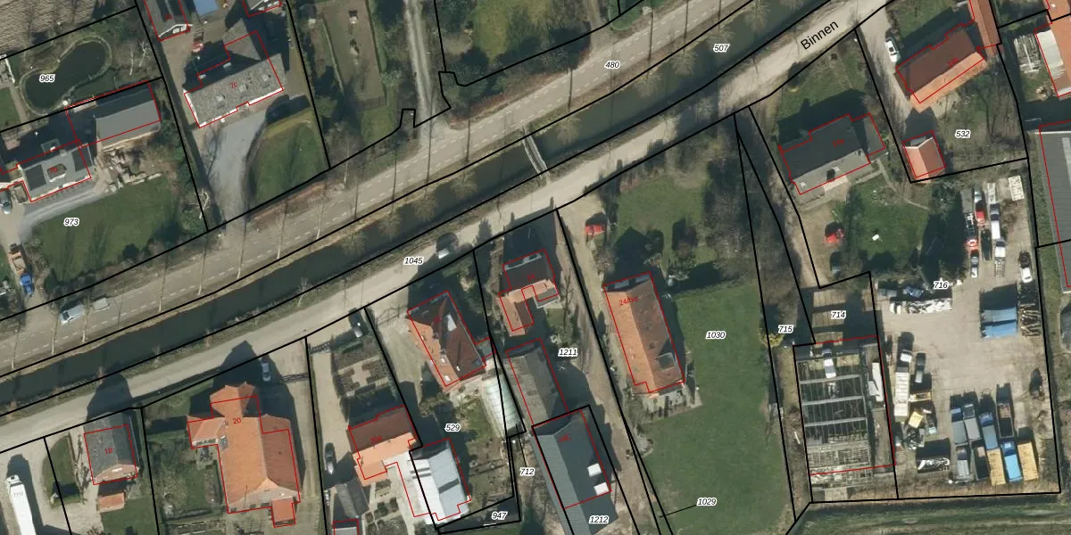 Het perceel waarop Binnen 24 staat heeft een oppervlakte van 1208 m². Dit is een zeer groot perceel. De perceeloppervlakte wordt geregistreerd door het Kadaster. Gedetailleerde informatie over de maten van dit perceel kunt u vinden in het rapport Kadastrale kaart met maatvoering van Binnen 24.
