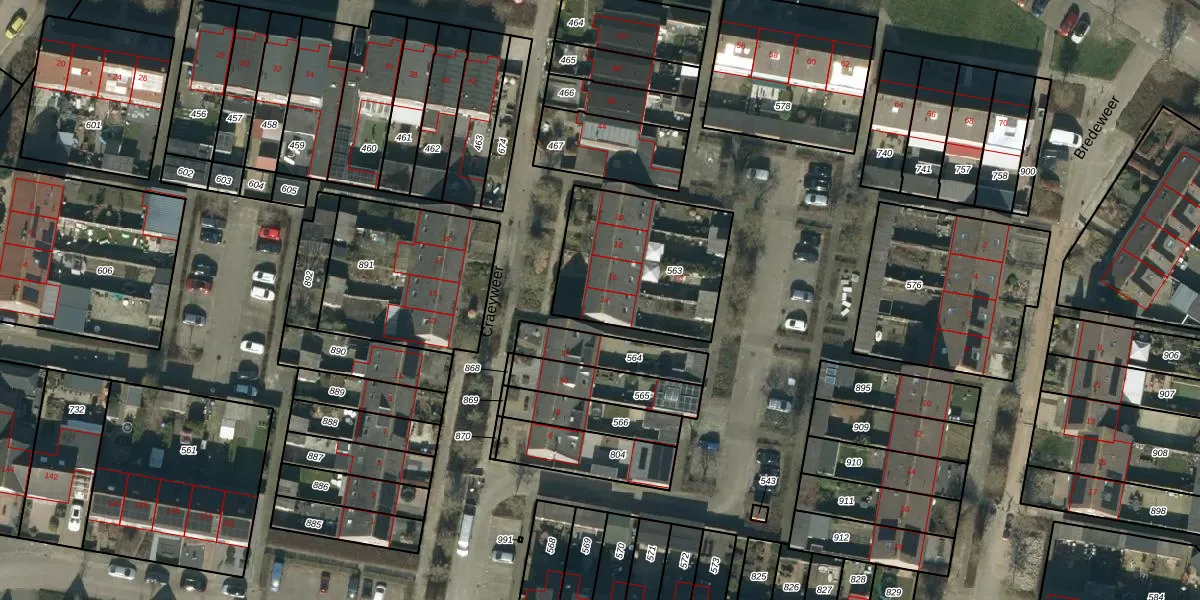Het perceel waarop Craeyweer 14 staat heeft een oppervlakte van 592 m². Dit is een groot perceel. De perceeloppervlakte wordt geregistreerd door het Kadaster. Gedetailleerde informatie over de maten van dit perceel kunt u vinden in het rapport Kadastrale kaart met maatvoering van Craeyweer 14.
