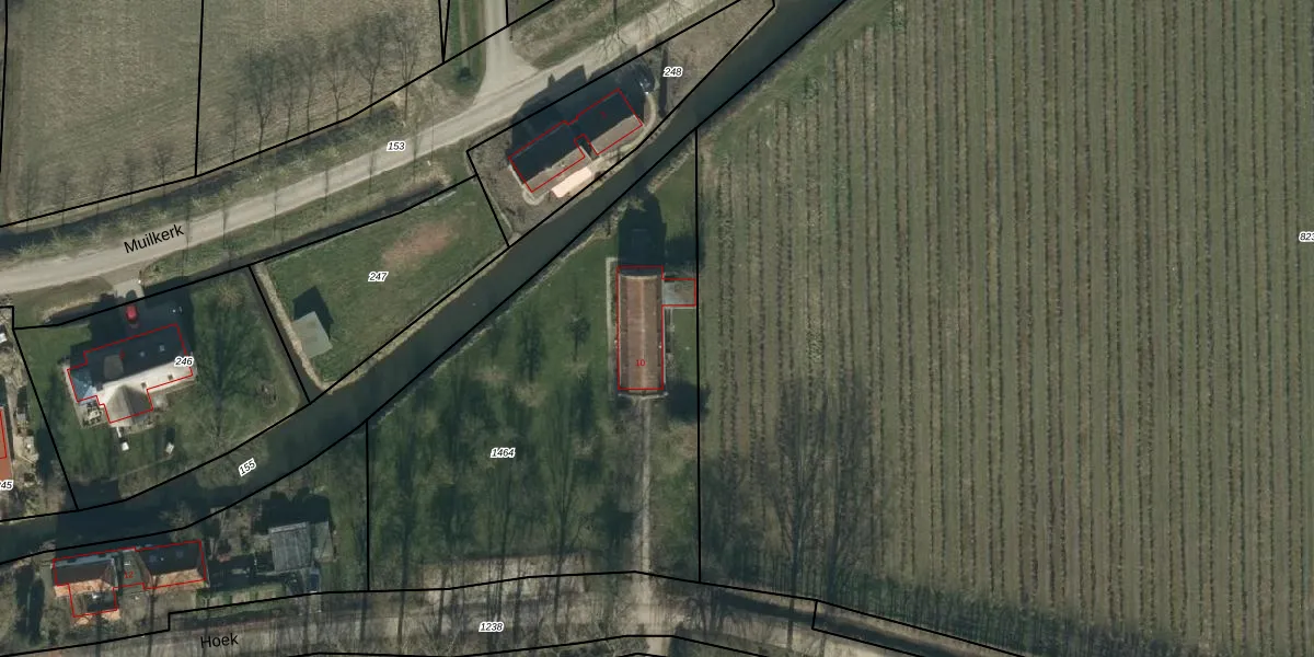 Het perceel waarop Hoek 10 staat heeft een oppervlakte van 2390 m². Dit is een zeer groot perceel. De perceeloppervlakte wordt geregistreerd door het Kadaster. Gedetailleerde informatie over de maten van dit perceel kunt u vinden in het rapport Kadastrale kaart met maatvoering van Hoek 10.