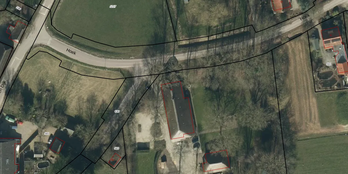 Het perceel waarop Hoek 47 staat heeft een oppervlakte van 2,0 ha. Dit is een zeer groot perceel. De perceeloppervlakte wordt geregistreerd door het Kadaster. Gedetailleerde informatie over de maten van dit perceel kunt u vinden in het rapport Kadastrale kaart met maatvoering van Hoek 47.