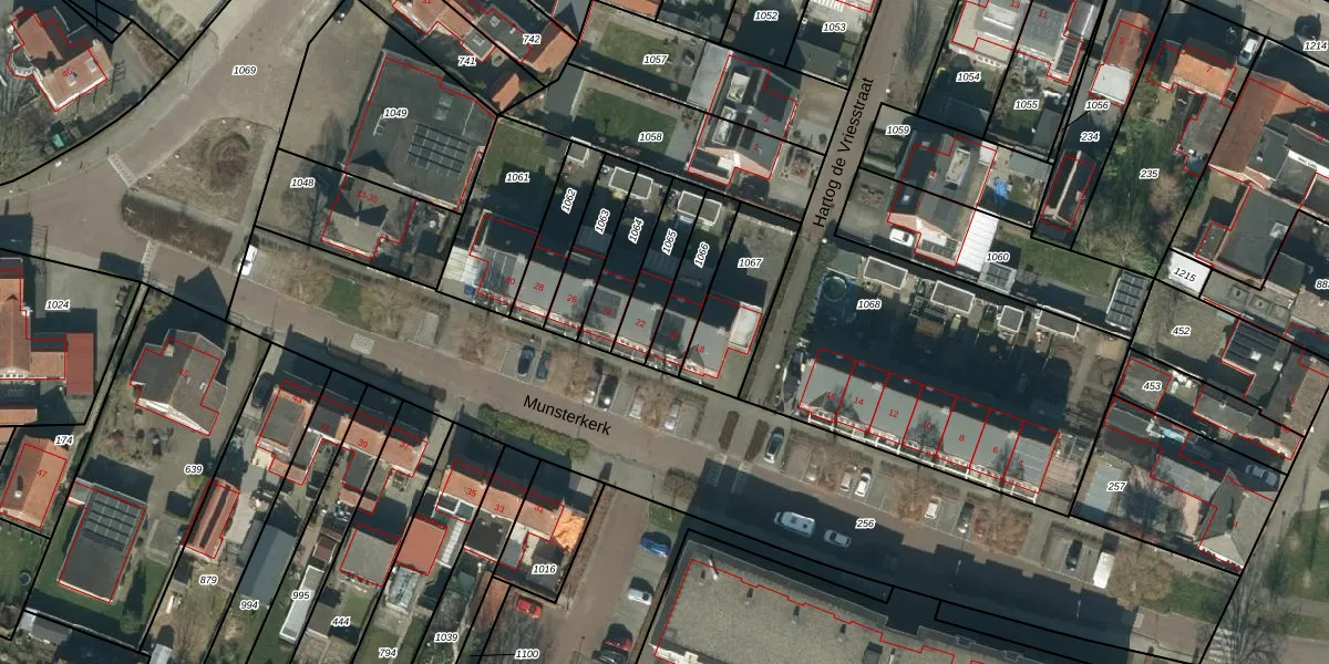 Het perceel waarop Munsterkerk 20 staat heeft een oppervlakte van 151 m². Dit is een middelgroot perceel. De perceeloppervlakte wordt geregistreerd door het Kadaster. Gedetailleerde informatie over de maten van dit perceel kunt u vinden in het rapport Kadastrale kaart met maatvoering van Munsterkerk 20.