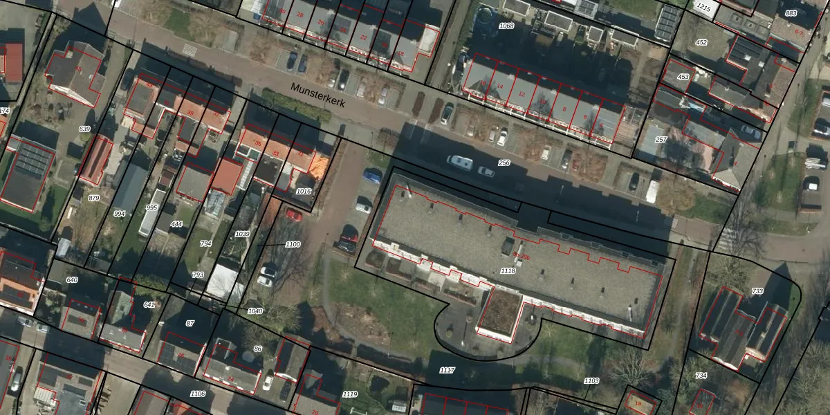 Het perceel waarop Munsterkerk 29-a staat heeft een oppervlakte van 2039 m². Dit is een zeer groot perceel. De perceeloppervlakte wordt geregistreerd door het Kadaster. Gedetailleerde informatie over de maten van dit perceel kunt u vinden in het rapport Kadastrale kaart met maatvoering van Munsterkerk 29-a.