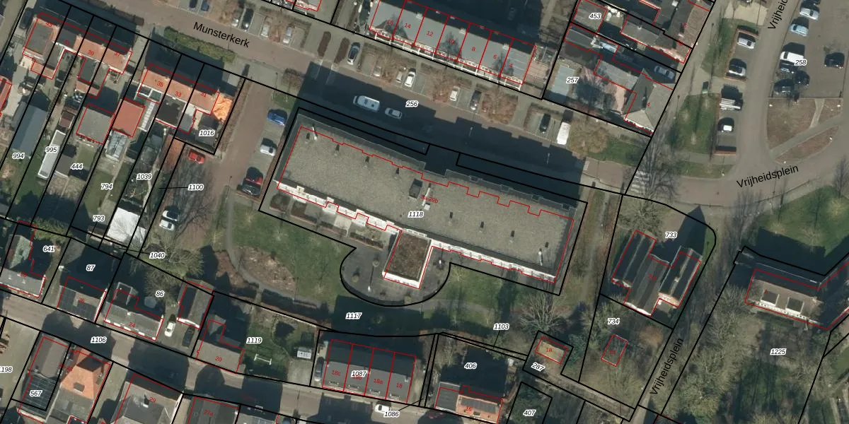 Het perceel waarop Munsterkerk 29-b staat heeft een oppervlakte van 2039 m². Dit is een zeer groot perceel. De perceeloppervlakte wordt geregistreerd door het Kadaster. Gedetailleerde informatie over de maten van dit perceel kunt u vinden in het rapport Kadastrale kaart met maatvoering van Munsterkerk 29-b.