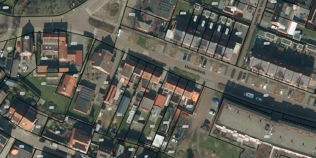 Het perceel waarop Munsterkerk 37 staat heeft een oppervlakte van 430 m². Dit is een groot perceel. De perceeloppervlakte wordt geregistreerd door het Kadaster. Gedetailleerde informatie over de maten van dit perceel kunt u vinden in het rapport Kadastrale kaart met maatvoering van Munsterkerk 37.