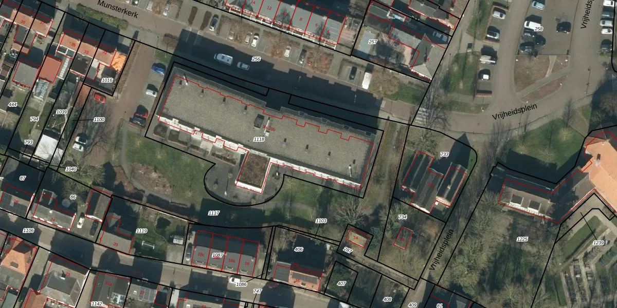 Het perceel waarop Munsterkerk 5-b staat heeft een oppervlakte van 2039 m². Dit is een zeer groot perceel. De perceeloppervlakte wordt geregistreerd door het Kadaster. Gedetailleerde informatie over de maten van dit perceel kunt u vinden in het rapport Kadastrale kaart met maatvoering van Munsterkerk 5-b.