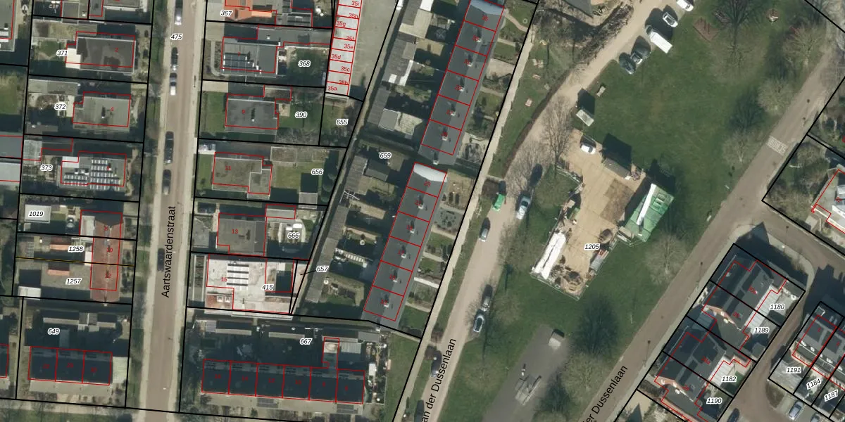 Het perceel waarop van der Dussenlaan 21 staat heeft een oppervlakte van 2591 m². Dit is een zeer groot perceel. De perceeloppervlakte wordt geregistreerd door het Kadaster. Gedetailleerde informatie over de maten van dit perceel kunt u vinden in het rapport Kadastrale kaart met maatvoering van van der Dussenlaan 21.