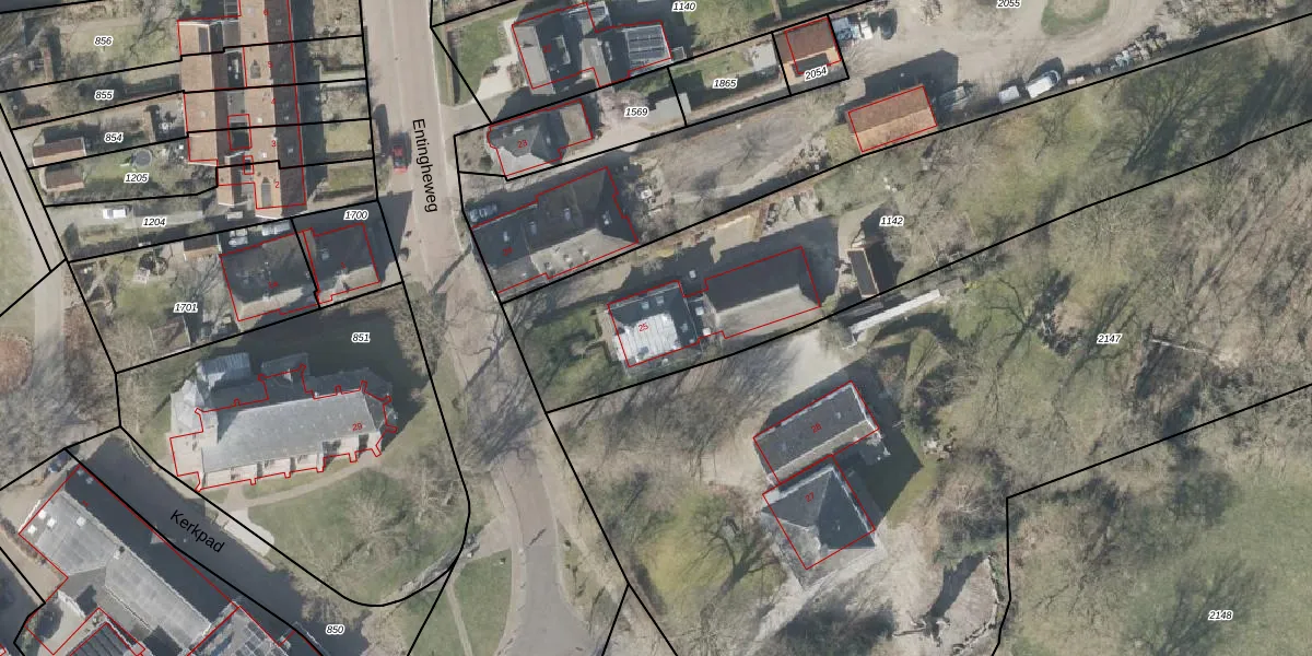 Entingheweg 25 is gelegen op kadastraal perceel DGL00K1142. Deze kadastrale aanduiding is uniek en wordt gebruikt door het Kadaster om eigendomsrechten en andere zakelijke rechten vast te leggen. Het perceel maakt onderdeel uit van de kadastrale gemeente Dwingeloo.