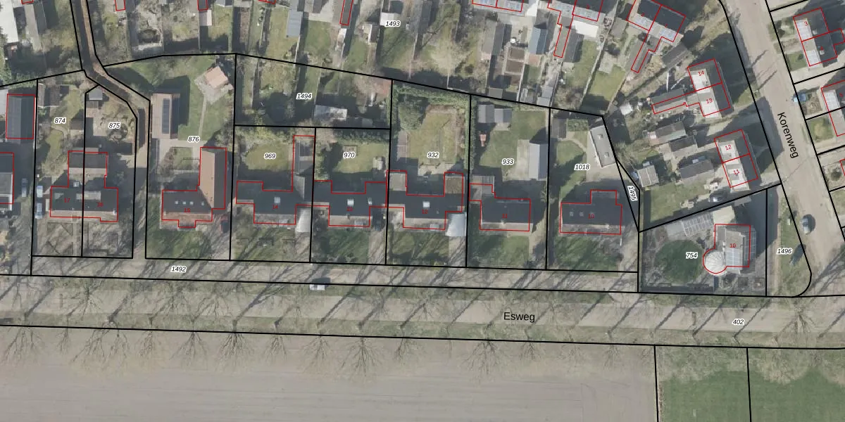 Het perceel waarop Esweg 12 staat heeft een oppervlakte van 820 m². Dit is een groot perceel. De perceeloppervlakte wordt geregistreerd door het Kadaster. Gedetailleerde informatie over de maten van dit perceel kunt u vinden in het rapport Kadastrale kaart met maatvoering van Esweg 12.