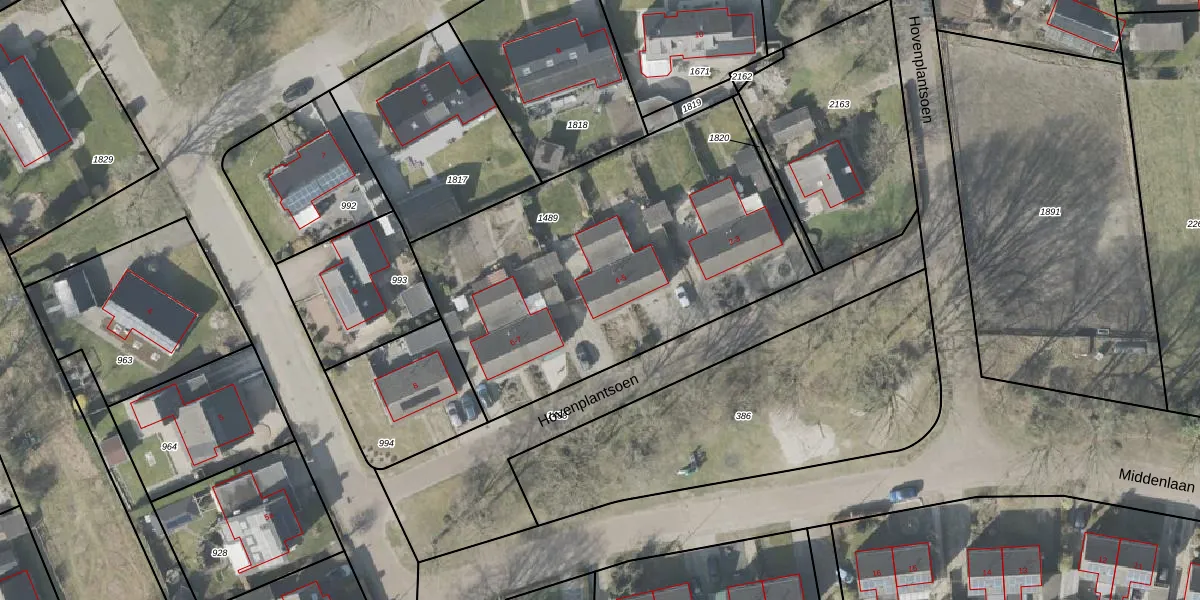 Het perceel waarop Hovenplantsoen 5 staat heeft een oppervlakte van 1925 m². Dit is een zeer groot perceel. De perceeloppervlakte wordt geregistreerd door het Kadaster. Gedetailleerde informatie over de maten van dit perceel kunt u vinden in het rapport Kadastrale kaart met maatvoering van Hovenplantsoen 5.