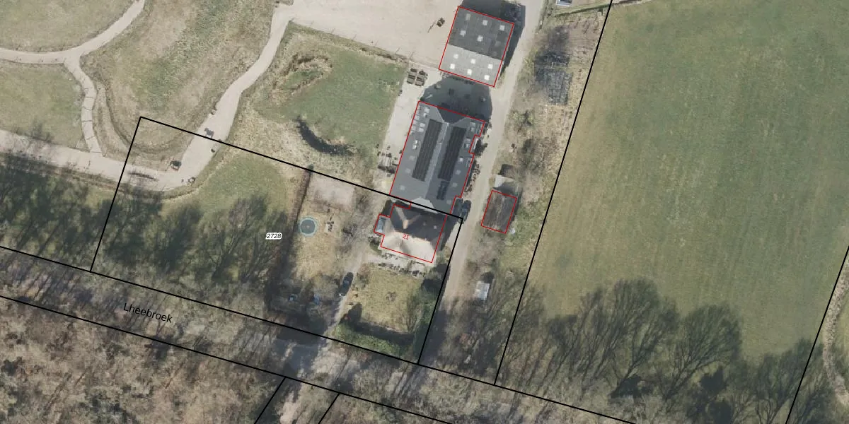 Het perceel waarop Lheebroek 21 staat heeft een oppervlakte van 2965 m². Dit is een zeer groot perceel. De perceeloppervlakte wordt geregistreerd door het Kadaster. Gedetailleerde informatie over de maten van dit perceel kunt u vinden in het rapport Kadastrale kaart met maatvoering van Lheebroek 21.