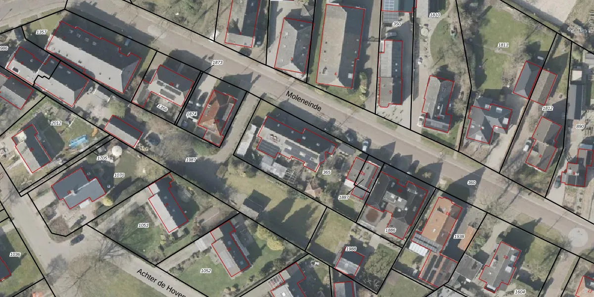 Het perceel waarop Moleneinde 22 staat heeft een oppervlakte van 950 m². Dit is een groot perceel. De perceeloppervlakte wordt geregistreerd door het Kadaster. Gedetailleerde informatie over de maten van dit perceel kunt u vinden in het rapport Kadastrale kaart met maatvoering van Moleneinde 22.