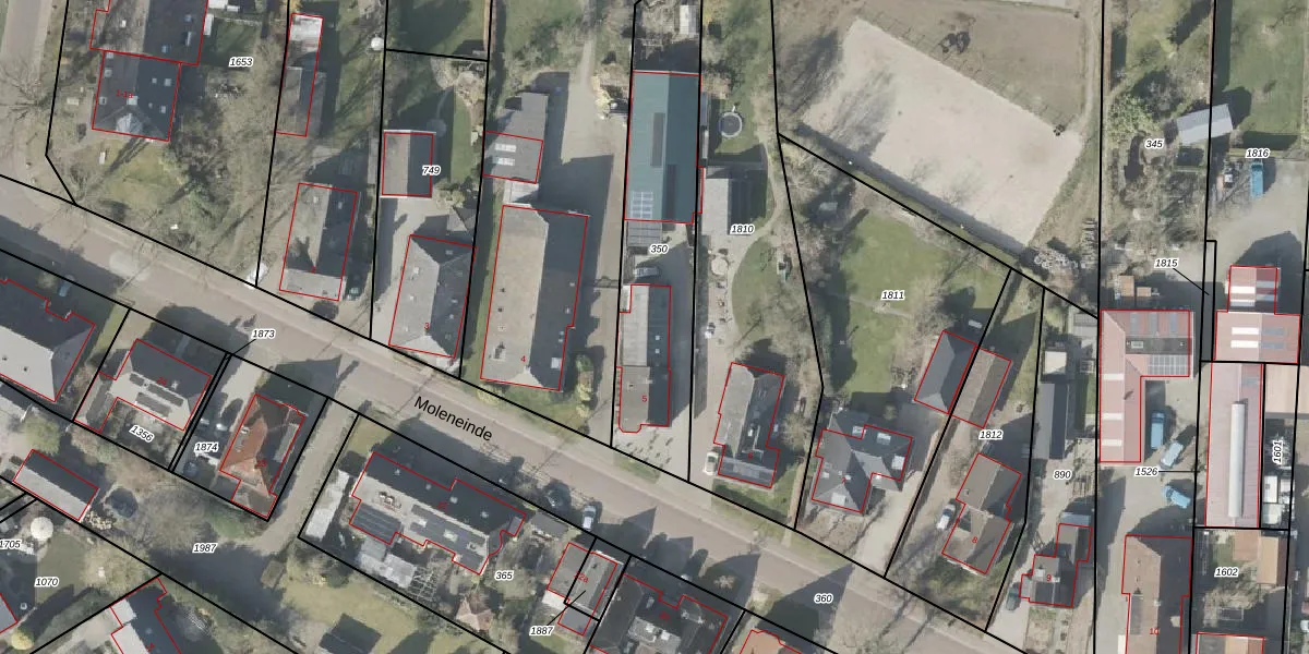 Het perceel waarop Moleneinde 5 staat heeft een oppervlakte van 820 m². Dit is een groot perceel. De perceeloppervlakte wordt geregistreerd door het Kadaster. Gedetailleerde informatie over de maten van dit perceel kunt u vinden in het rapport Kadastrale kaart met maatvoering van Moleneinde 5.