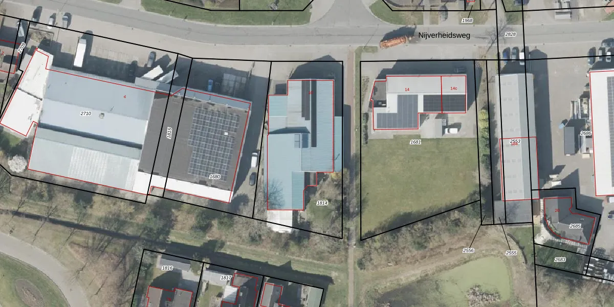 Het perceel waarop Nijverheidsweg 10 staat heeft een oppervlakte van 1438 m². Dit is een zeer groot perceel. De perceeloppervlakte wordt geregistreerd door het Kadaster. Gedetailleerde informatie over de maten van dit perceel kunt u vinden in het rapport Kadastrale kaart met maatvoering van Nijverheidsweg 10.