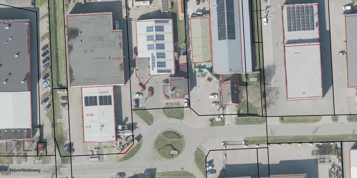 Het perceel waarop Nijverheidsweg 21 staat heeft een oppervlakte van 2107 m². Dit is een zeer groot perceel. De perceeloppervlakte wordt geregistreerd door het Kadaster. Gedetailleerde informatie over de maten van dit perceel kunt u vinden in het rapport Kadastrale kaart met maatvoering van Nijverheidsweg 21.