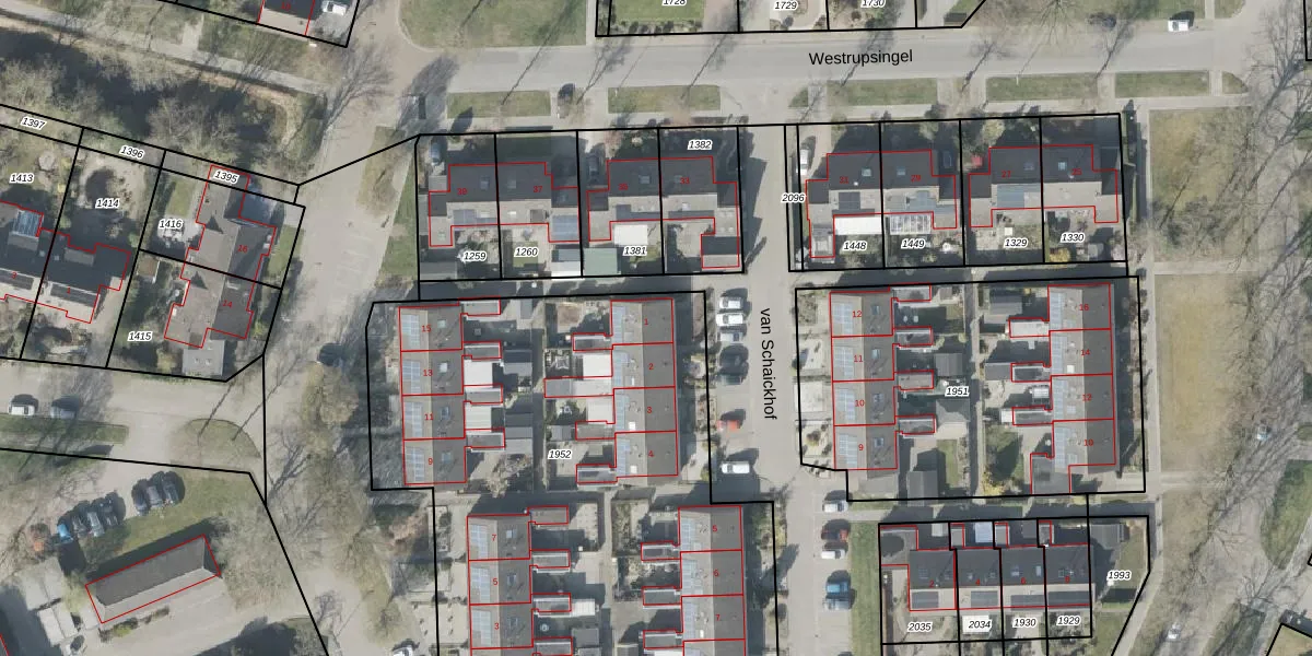 Het perceel waarop van Schaickhof 1 staat heeft een oppervlakte van 3123 m². Dit is een zeer groot perceel. De perceeloppervlakte wordt geregistreerd door het Kadaster. Gedetailleerde informatie over de maten van dit perceel kunt u vinden in het rapport Kadastrale kaart met maatvoering van van Schaickhof 1.