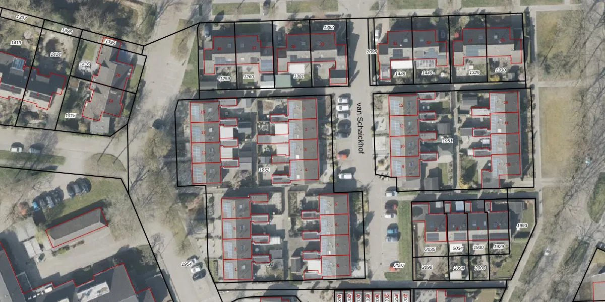 Het perceel waarop van Schaickhof 3 staat heeft een oppervlakte van 3123 m². Dit is een zeer groot perceel. De perceeloppervlakte wordt geregistreerd door het Kadaster. Gedetailleerde informatie over de maten van dit perceel kunt u vinden in het rapport Kadastrale kaart met maatvoering van van Schaickhof 3.