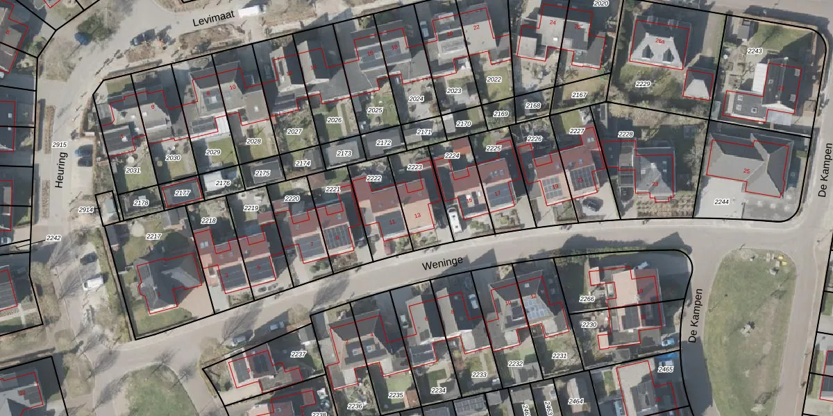 Het perceel waarop Weninge 13 staat heeft een oppervlakte van 238 m². Dit is een middelgroot perceel. De perceeloppervlakte wordt geregistreerd door het Kadaster. Gedetailleerde informatie over de maten van dit perceel kunt u vinden in het rapport Kadastrale kaart met maatvoering van Weninge 13.