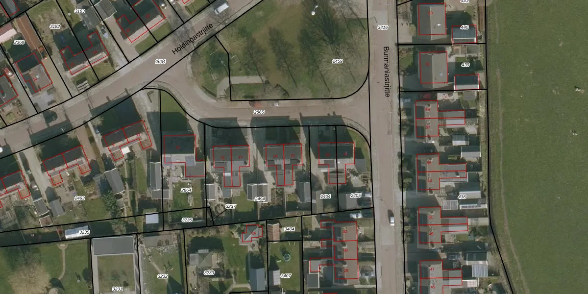 Het perceel waarop Holdingastrjitte 21 staat heeft een oppervlakte van 1115 m². Dit is een zeer groot perceel. De perceeloppervlakte wordt geregistreerd door het Kadaster. Gedetailleerde informatie over de maten van dit perceel kunt u vinden in het rapport Kadastrale kaart met maatvoering van Holdingastrjitte 21.