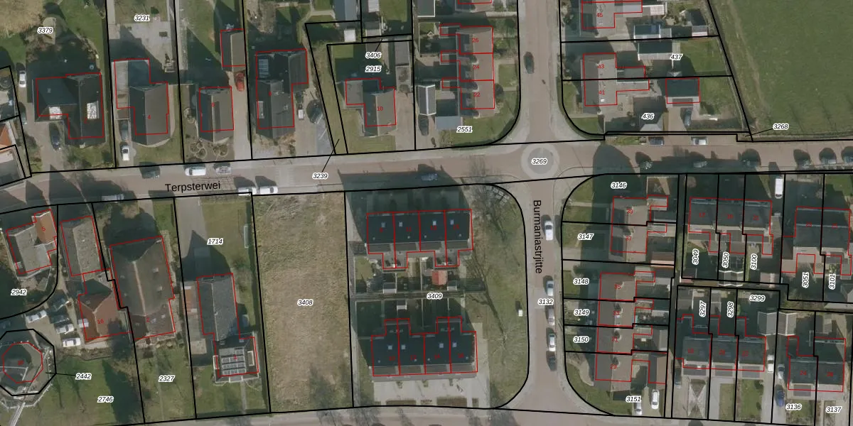 Het perceel waarop Terpsterwei 13 staat heeft een oppervlakte van 2085 m². Dit is een zeer groot perceel. De perceeloppervlakte wordt geregistreerd door het Kadaster. Gedetailleerde informatie over de maten van dit perceel kunt u vinden in het rapport Kadastrale kaart met maatvoering van Terpsterwei 13.