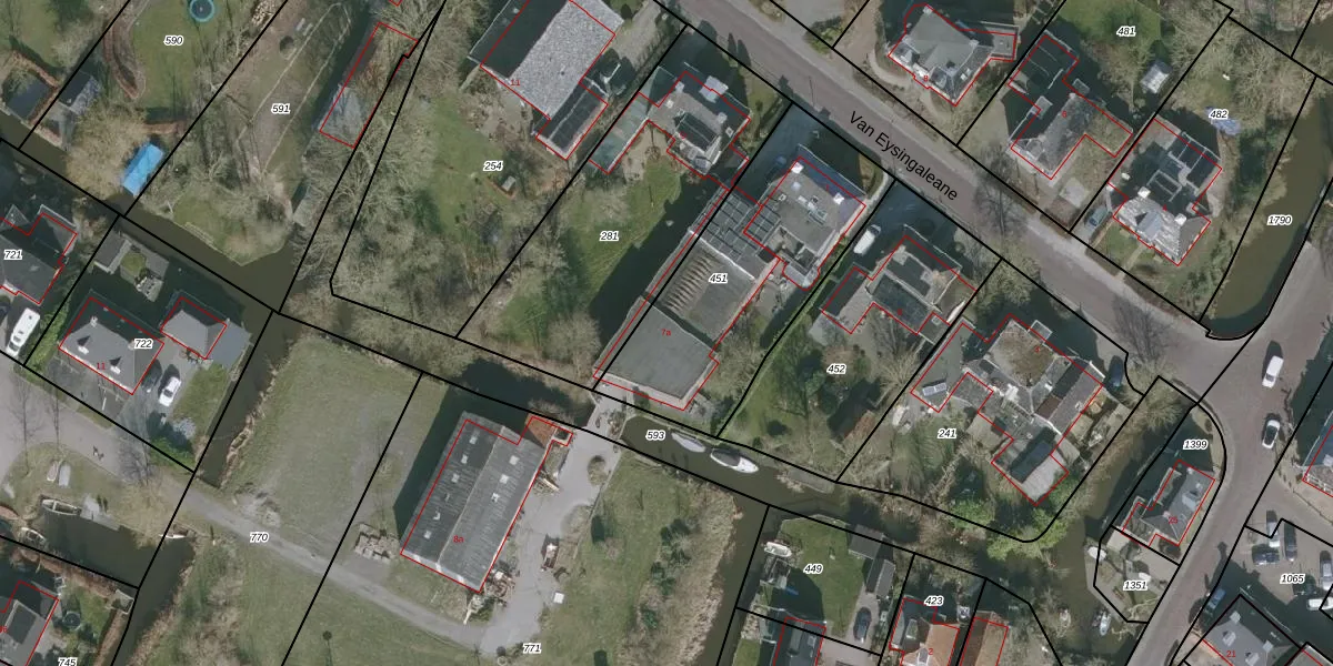Het perceel waarop Van Eysingaleane 7-a staat heeft een oppervlakte van 921 m². Dit is een groot perceel. De perceeloppervlakte wordt geregistreerd door het Kadaster. Gedetailleerde informatie over de maten van dit perceel kunt u vinden in het rapport Kadastrale kaart met maatvoering van Van Eysingaleane 7-a.