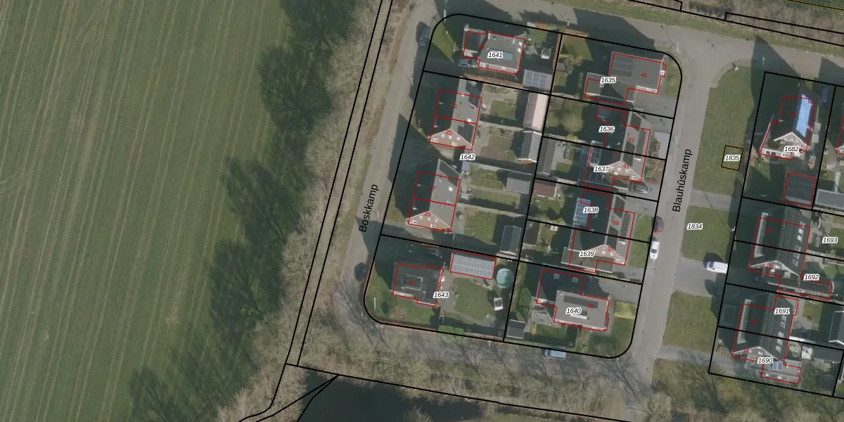 Het perceel waarop Boskkamp 29 staat heeft een oppervlakte van 1280 m². Dit is een zeer groot perceel. De perceeloppervlakte wordt geregistreerd door het Kadaster. Gedetailleerde informatie over de maten van dit perceel kunt u vinden in het rapport Kadastrale kaart met maatvoering van Boskkamp 29.