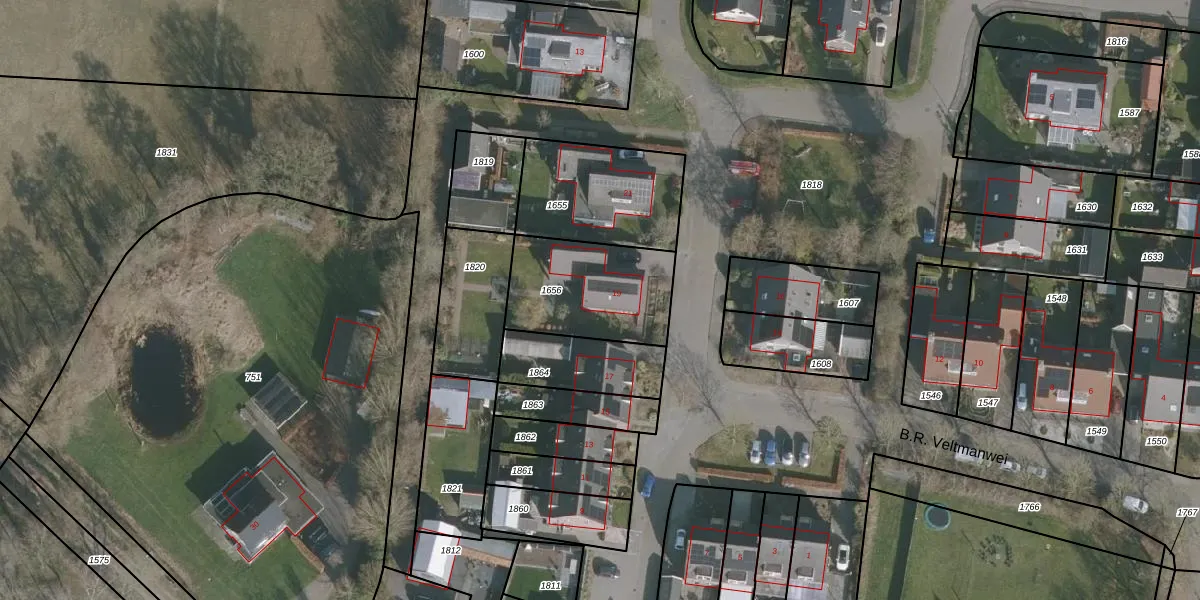 Het perceel waarop B.R. Veltmanwei 19 staat heeft een oppervlakte van 431 m². Dit is een groot perceel. De perceeloppervlakte wordt geregistreerd door het Kadaster. Gedetailleerde informatie over de maten van dit perceel kunt u vinden in het rapport Kadastrale kaart met maatvoering van B.R. Veltmanwei 19.