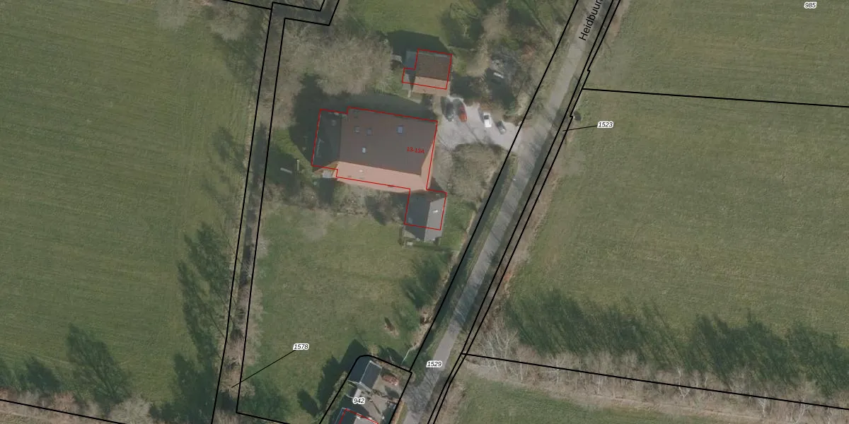 Het perceel waarop Heidbuurtweg 13-A staat heeft een oppervlakte van 7605 m². Dit is een zeer groot perceel. De perceeloppervlakte wordt geregistreerd door het Kadaster. Gedetailleerde informatie over de maten van dit perceel kunt u vinden in het rapport Kadastrale kaart met maatvoering van Heidbuurtweg 13-A.