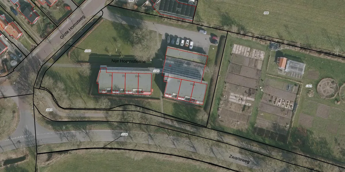 Het perceel waarop Nije Hoarnstleane 9 staat heeft een oppervlakte van 5000 m². Dit is een zeer groot perceel. De perceeloppervlakte wordt geregistreerd door het Kadaster. Gedetailleerde informatie over de maten van dit perceel kunt u vinden in het rapport Kadastrale kaart met maatvoering van Nije Hoarnstleane 9.