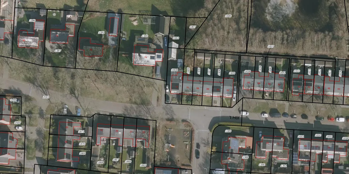 Het perceel waarop 't Hôf 72 staat heeft een oppervlakte van 300 m². Dit is een groot perceel. De perceeloppervlakte wordt geregistreerd door het Kadaster. Gedetailleerde informatie over de maten van dit perceel kunt u vinden in het rapport Kadastrale kaart met maatvoering van 't Hôf 72.