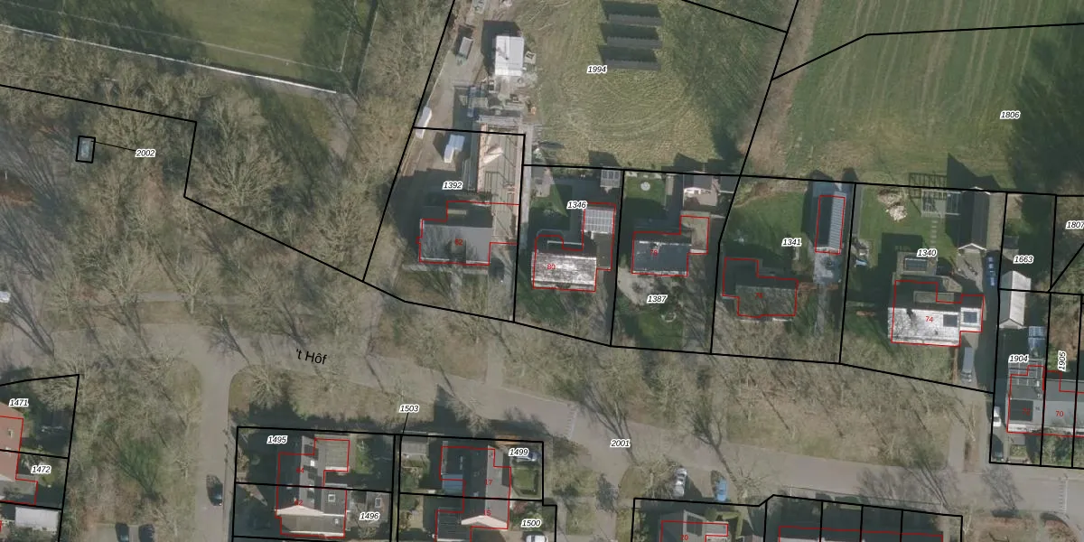 Het perceel waarop 't Hôf 80 staat heeft een oppervlakte van 569 m². Dit is een groot perceel. De perceeloppervlakte wordt geregistreerd door het Kadaster. Gedetailleerde informatie over de maten van dit perceel kunt u vinden in het rapport Kadastrale kaart met maatvoering van 't Hôf 80.