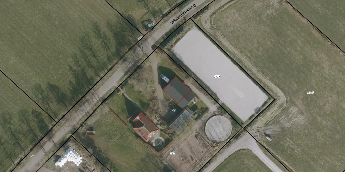 Het perceel waarop Witveensterweg 18 staat heeft een oppervlakte van 4830 m². Dit is een zeer groot perceel. De perceeloppervlakte wordt geregistreerd door het Kadaster. Gedetailleerde informatie over de maten van dit perceel kunt u vinden in het rapport Kadastrale kaart met maatvoering van Witveensterweg 18.