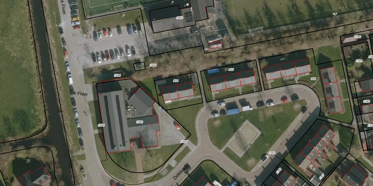 Het perceel waarop Doktersfiif 20 staat heeft een oppervlakte van 385 m². Dit is een groot perceel. De perceeloppervlakte wordt geregistreerd door het Kadaster. Gedetailleerde informatie over de maten van dit perceel kunt u vinden in het rapport Kadastrale kaart met maatvoering van Doktersfiif 20.